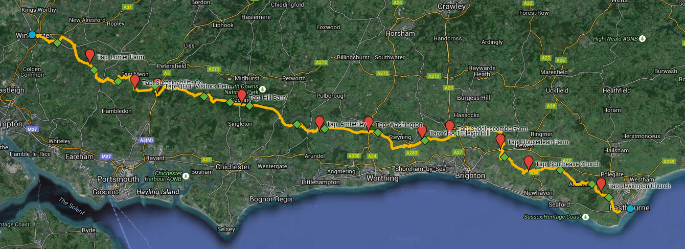 In the week leading up to the attempt I built up a Google map, plotting the route, along with major hills and the all important water tap locations. bikedowns.co.uk was an invaluable resource to help me locate the taps, and the pictures gave me a good mental picture of what to look out for when I was approaching them.